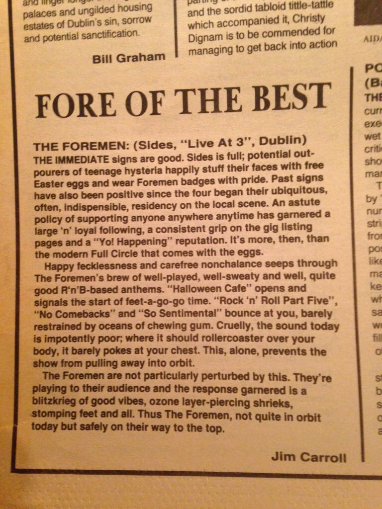The Foremen also scored their own residency in the Gratton Hotel. Between that, the support shows and more, by 1988 they were playing a gig a week. This included the now-antiquated idea of no-alcohol shows for kids in the afternoon at McGonagles on St. Anne Street. Jim Carroll gave them a nice write-up in Hot Press.